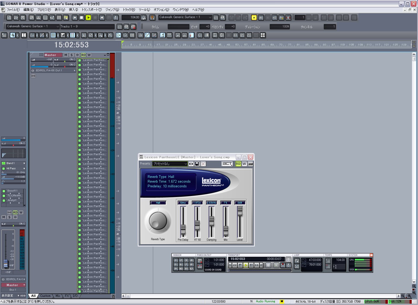 最終的には全部のパートをAudioトラックに変換するんですが、そこへEQやらコンプやらを差し込んだままだともうDropOutが発生し始めるので、キック、スネア、ハイハット・・・と分けて録ってるドラムの各パートをバランス取った上でひとつのトラックにまとめて録り直し・・・とかを続けて同時再生するトラック数を束ねて減らして何とかしていた、という感じです。